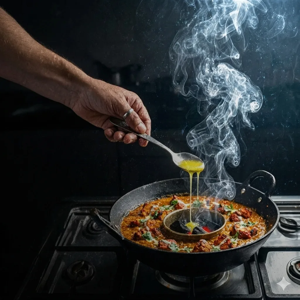 Ghee (geklärte Butter) ist die Schlüsselzutat. Ein Esslöffel wird auf glühende Holzkohle in einem kleinen Gefäß oder auf Alufolie im Topf gegeben. Kurz abdecken (ca. 5 Minuten), damit sich das Raucharoma entfaltet – typisch für den Tandoor-Geschmack.